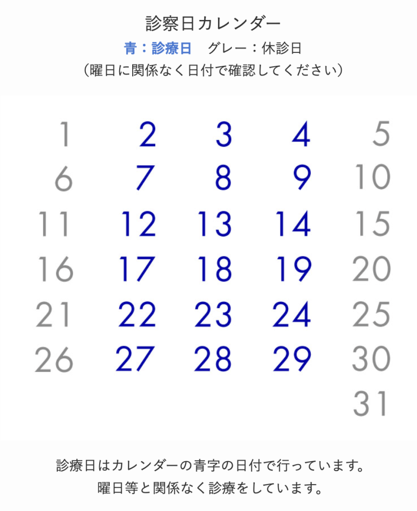 当院は曜日固定ではなく、カレンダーの日付(青字)で診療を行っております。休診日(グレー字)にご連絡いただいた場合、お返事が翌診療日となりますのでご了承ください。